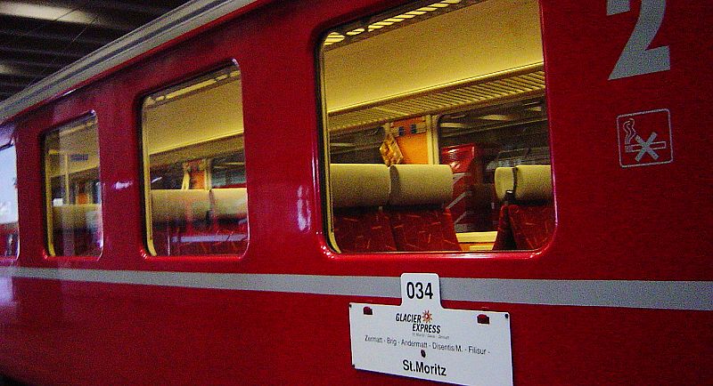 離開策馬,開往茵特拉根,搭乘往聖摩里斯St.Moritz 的冰河列車,車廂的人寥寥無幾,有一個來自於馬來西亞的小姐跟我攀談,她提議跟她一起去7-8小時遠的聖磨里斯這樣一趟來回鐵定夠本,差點就改變行程。旅程進行中網路訂房可以事先取消或延後,是自由行富有趣味與彈性的地方.到達茵特拉根後,要轉往格林華德就不一定是同樣這班車了。
